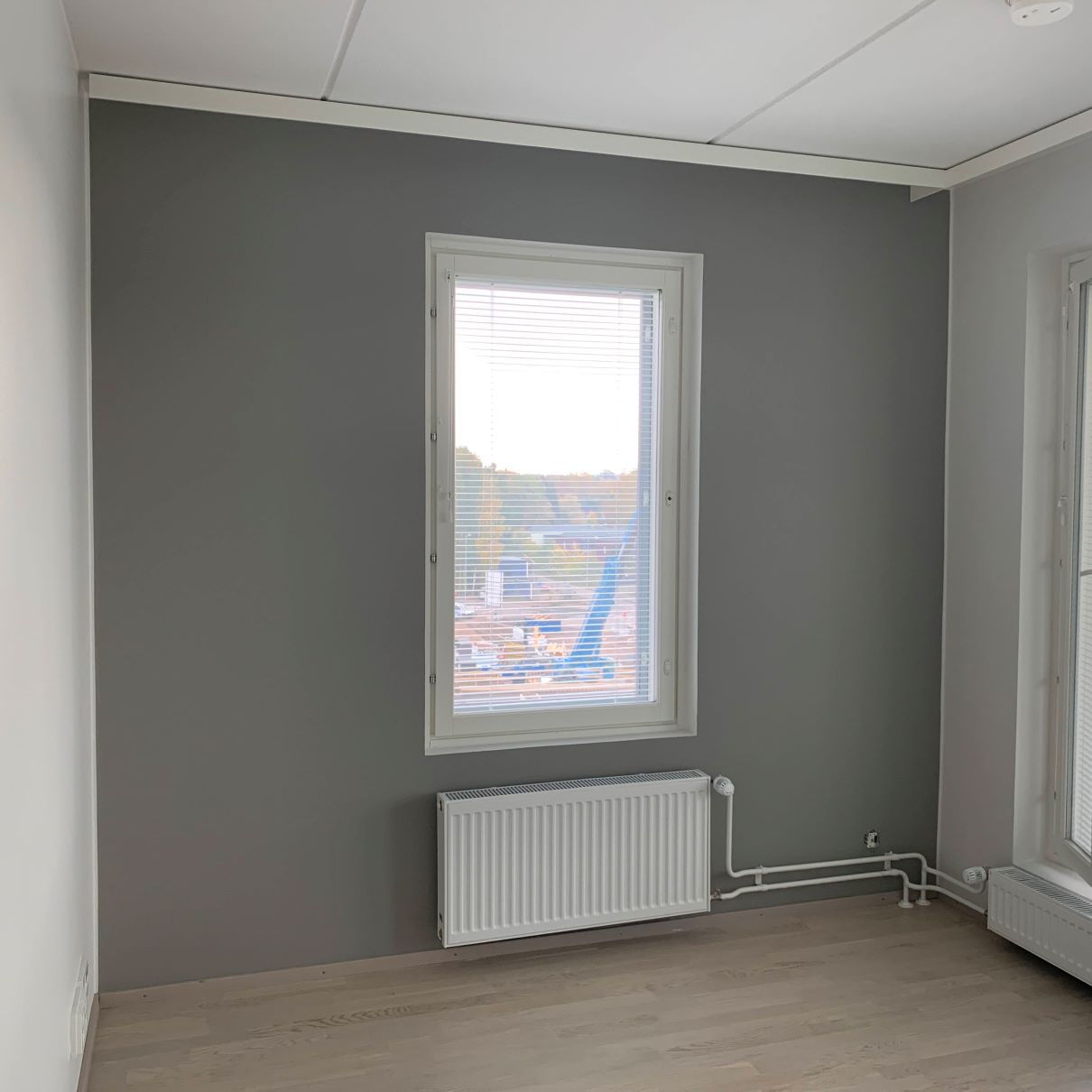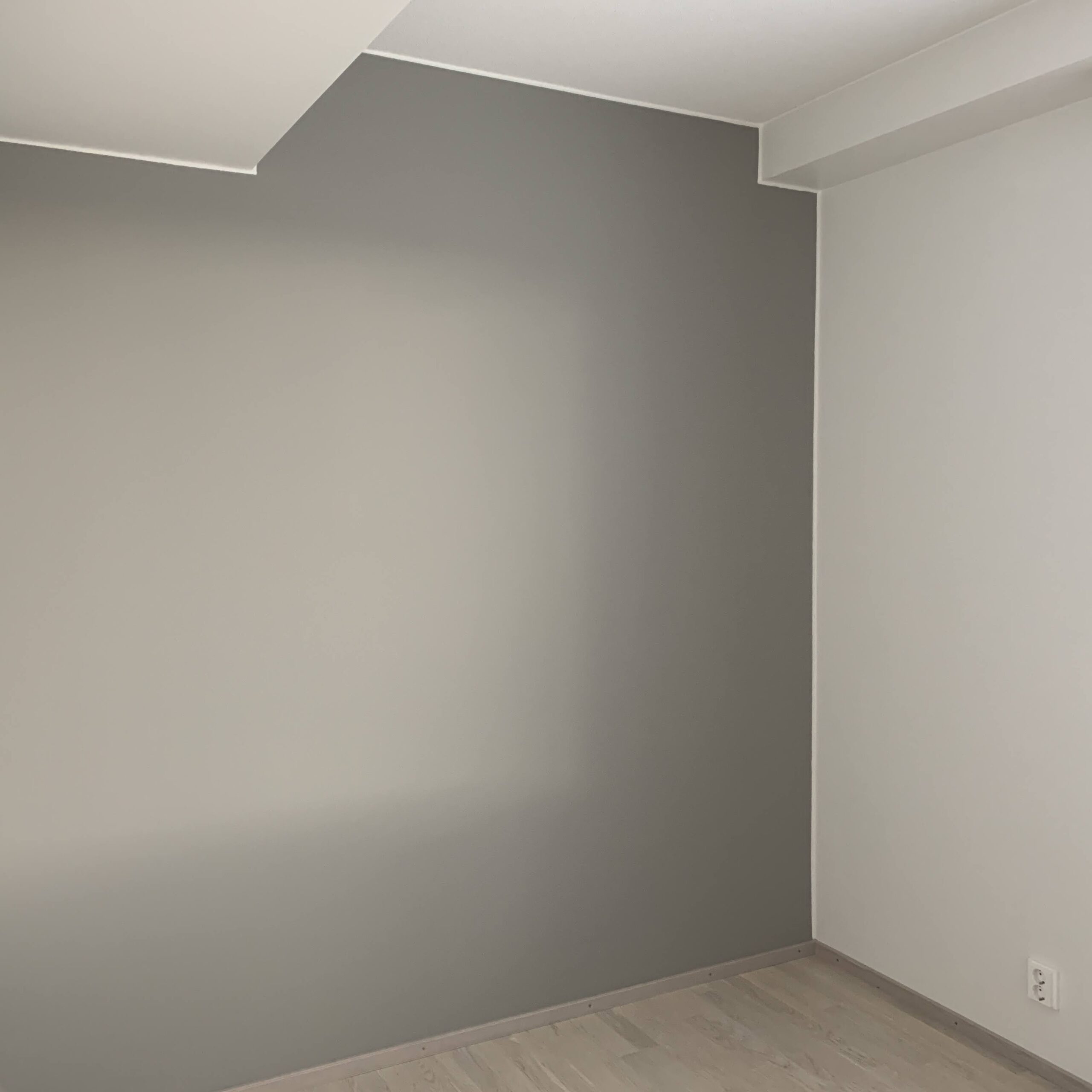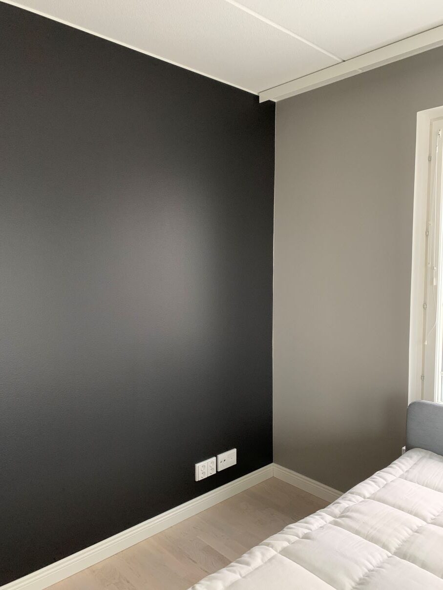 Asunto oli melko uusi ja seinäpinnat olivat hyvässä kunnossa, mutta asiakas toivoi niihin kuitenkin omaa persoonaa ja uutta ilmettä toteutettavaksi ennen muuttoa. Remontissa makuuhuoneesta poistettiin tapetti ja seinät maalattiin kahdella eri sävyllä mustalla ja harmaalla sävyllä Kalsiitti K487. Olohuoneeseen valittiin sävyksi N437. Näyttävät uudet jalkalistat ja oven peitelistat maalattiin olohuoneessa seinän sävyllä ennen asennusta.