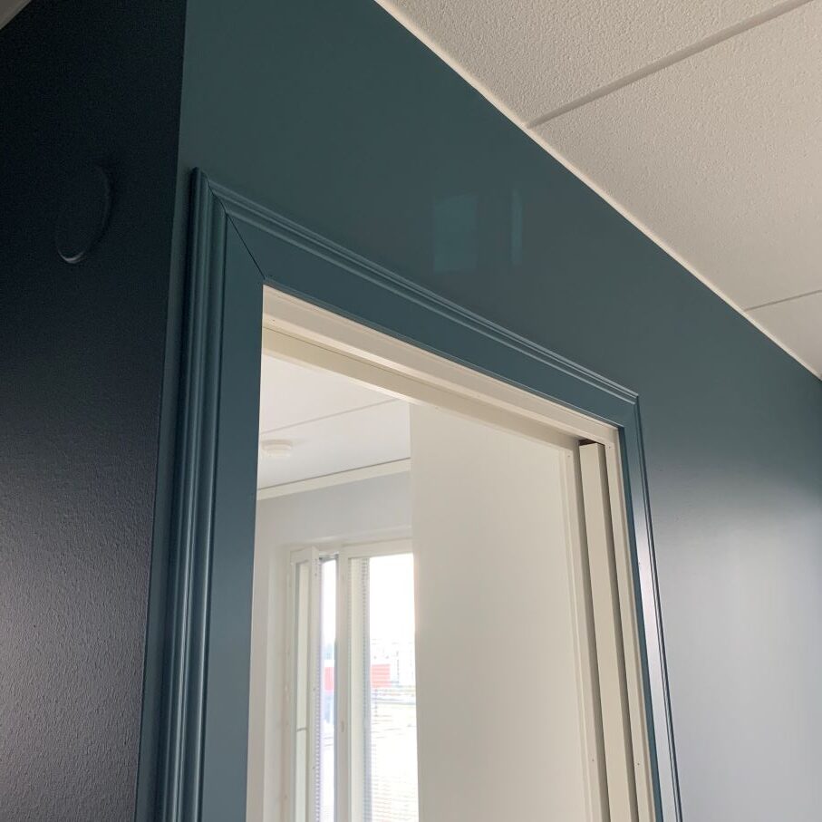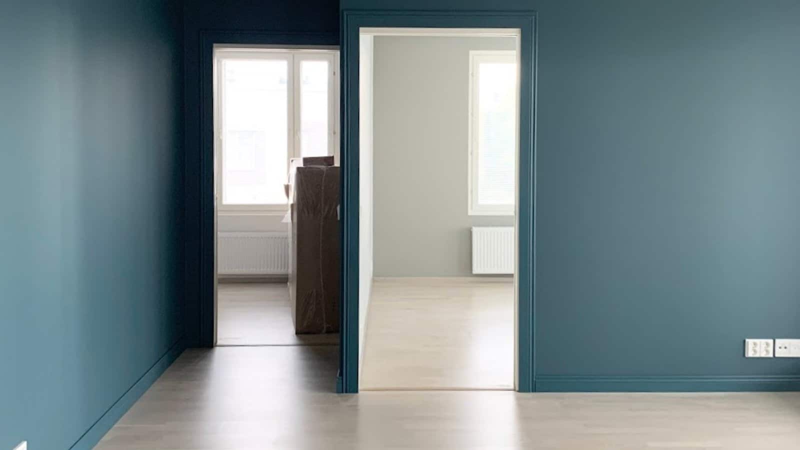 Tämän Espoolaiskolmion seinäpinnat saivat uuden ilmeen maalilla ja näyttävillä seinän sävyyn maalatuilla jalkalistoilla.